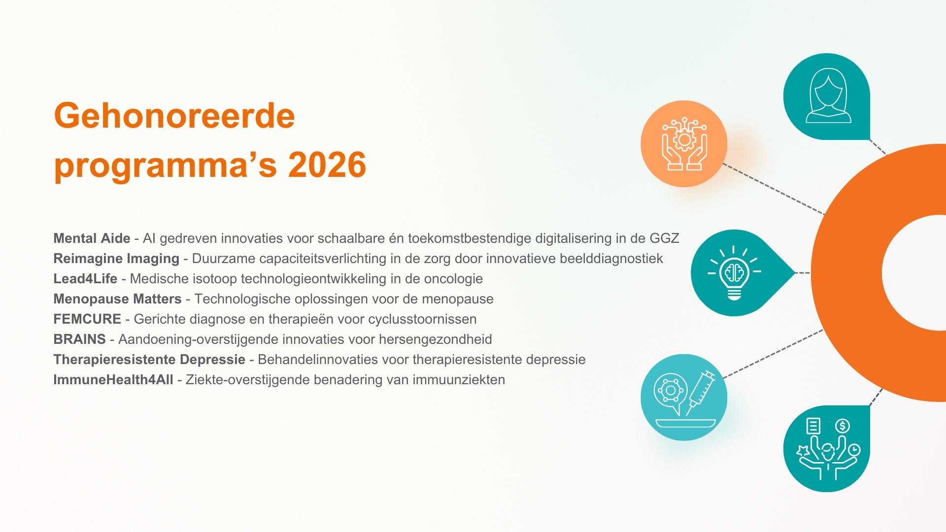 - Snellere en betere diagnostiek: het ontwikkelen van zelftests met biomarkers, digitale toepassingen (mHealth), (AI-gestuurde) snelle diagnostiek en geavanceerde beeldvorming.